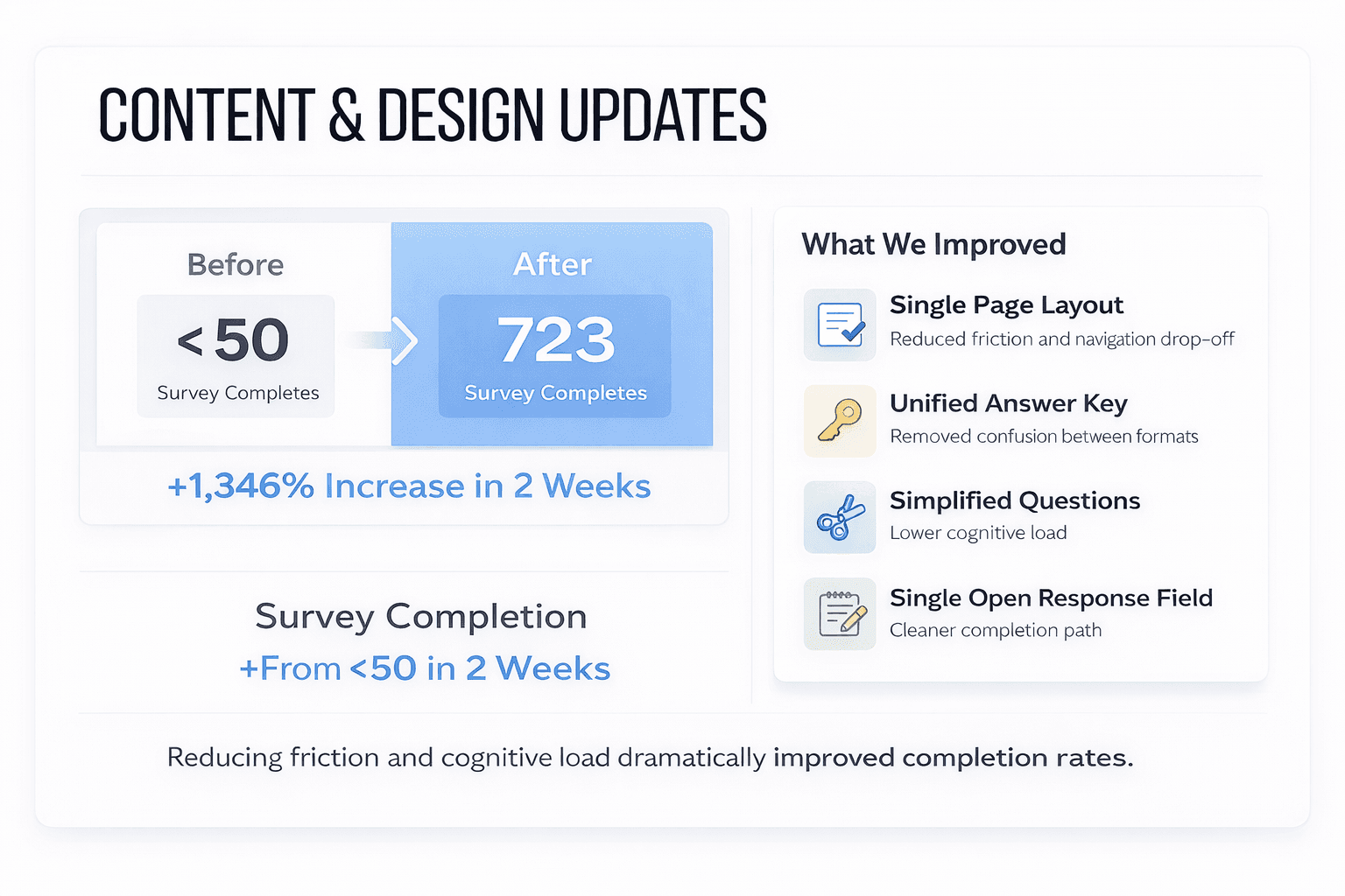 Beyond the immediate lift in completion, this work established a repeatable survey model: